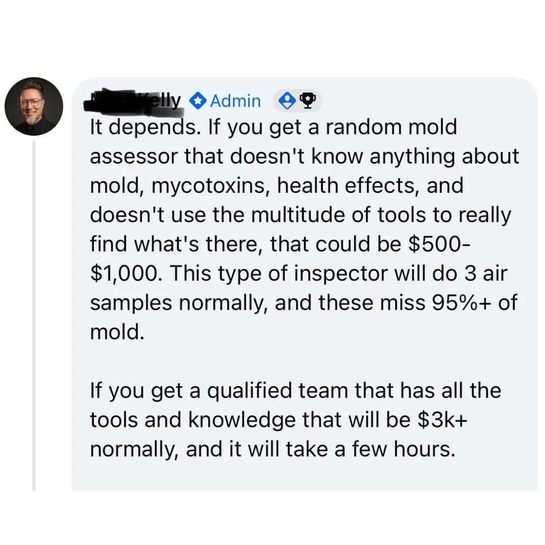 According to Google an AI search results, the average cost for mold testing will be between $300 and $1043 depending on who you call and what is done.